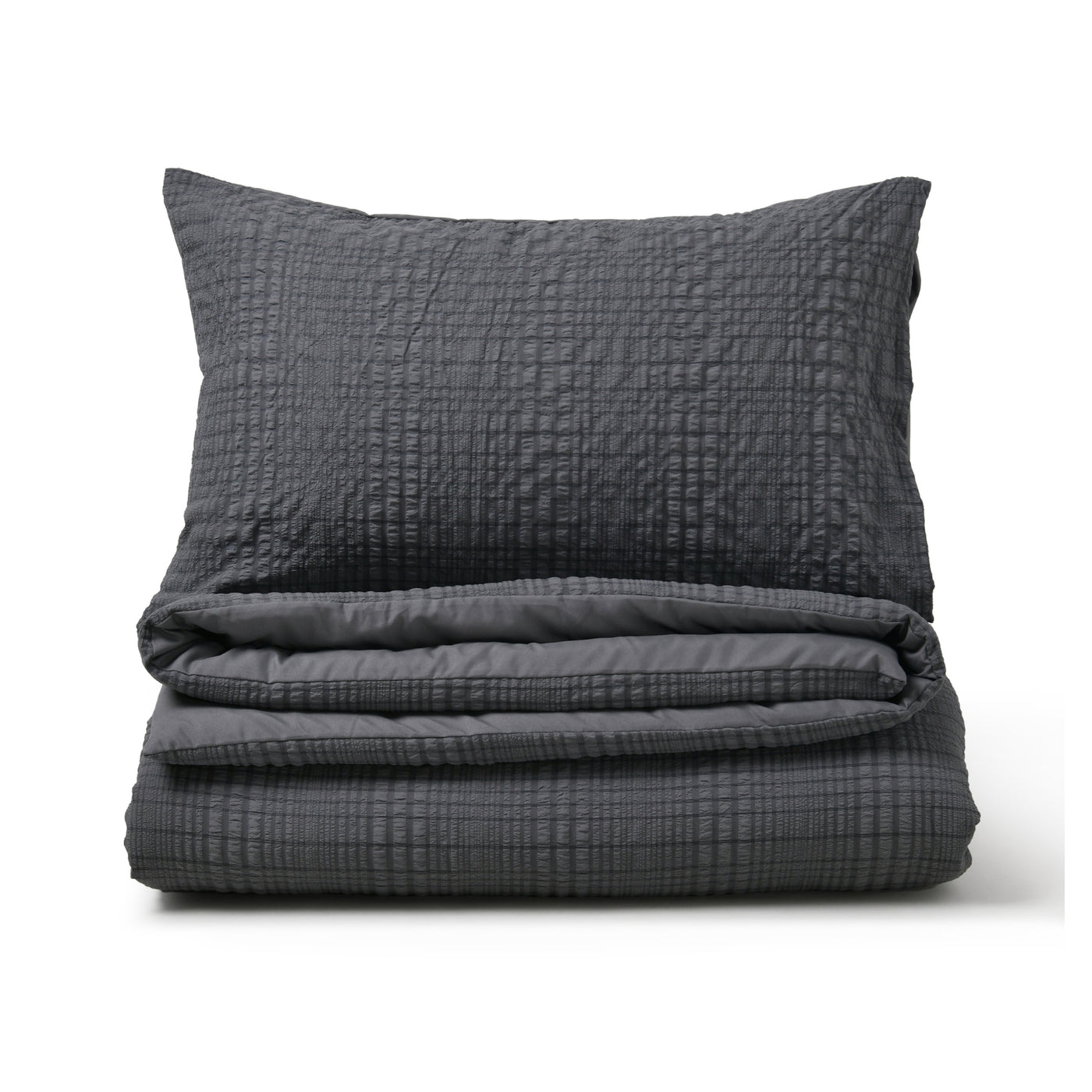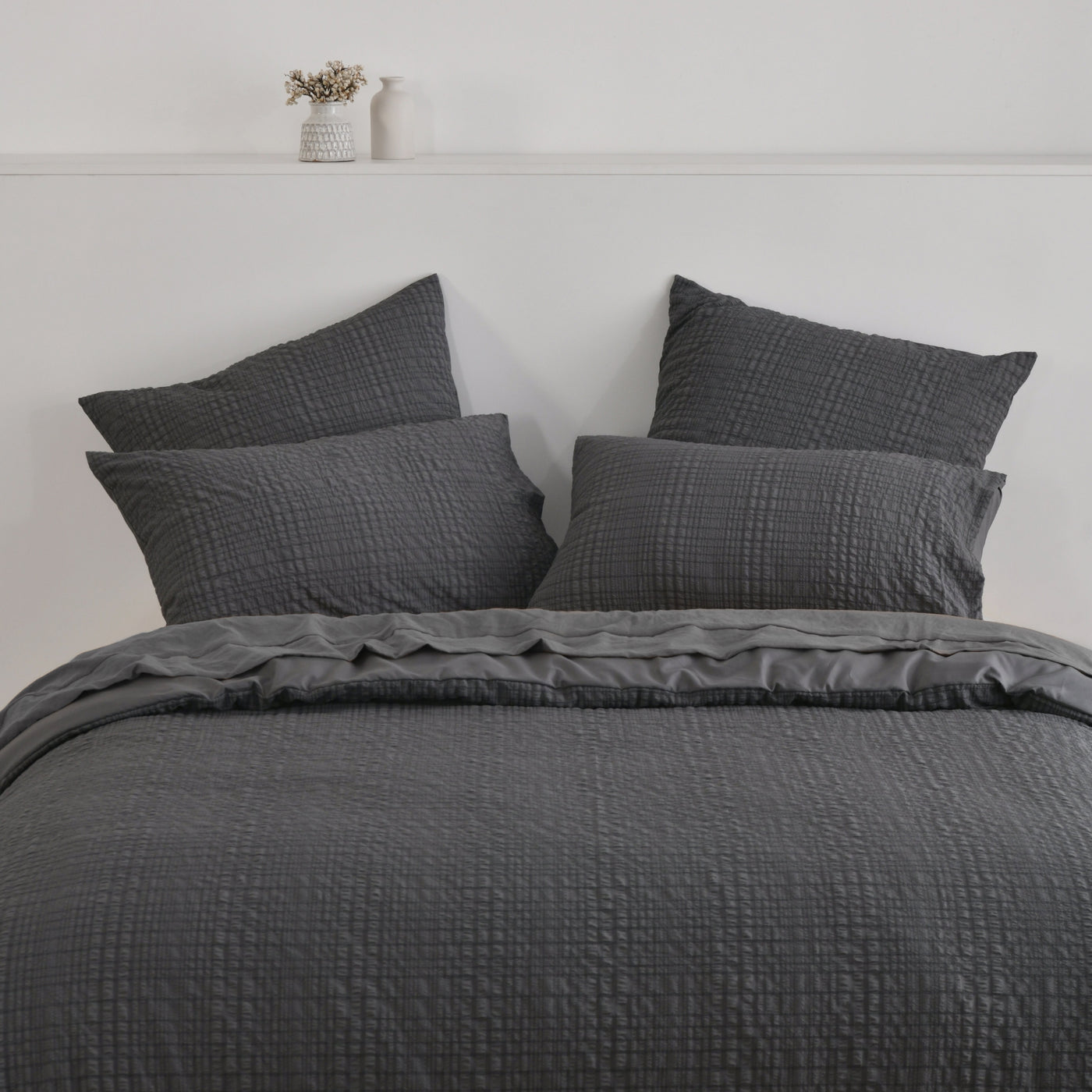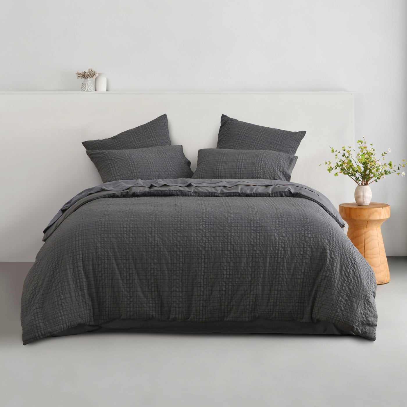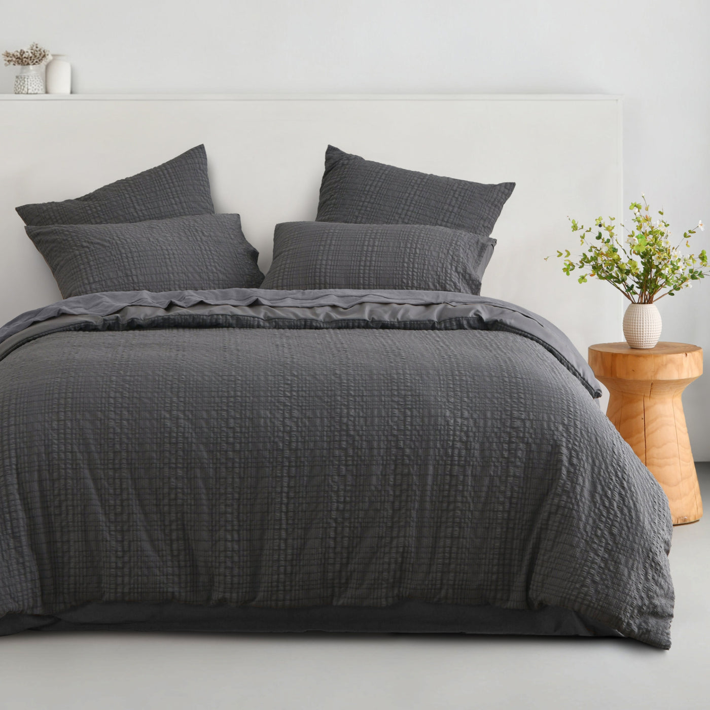 Elevate your bedroom with understated texture and rich colour using our Ellis Seersucker Quilt Cover Set. The Ellis quilt cover and matching pillowcase(s) features a subtle two-toned seersucker crinkle for visual depth and dimension. The textured top is paired with a smooth microfibre reverse that's buttery soft against the skin.Features• Textured two-toned seersucker• Buttery soft microfibre reverse• Machine washable, quick drying and easy care• No ironing required thanks to the subtle texture• Designed to coordinate with the Dreamaker Superfine rangeSizesSingle - Quilt Cover 140 x 210cm | 1 Pillowcase 48 x 73cmKing Single - Quilt Cover 160 x 210cm | 1 Pillowcase 48 x 73cmDouble - Quilt Cover 180 x 210cm | 2 Pillowcases 48 x 73cmQueen - Quilt Cover 210 x 210cm | 2 Pillowcases 48 x 73cmKing - Quilt Cover 245 x 210cm | 2 Pillowcases 48 x 73cmSuper King - Quilt Cover 270 x 240cm | 2 Pillowcases 48 x 73cmMaterialMicrofibreCare InstructionsWash separately before first use. Cold gentle machine wash with simlar colours. Colour safe detergent recommended. Tumble dry low. Iron on reverse only. Do not bleach. Do not dry clean.Made in China.