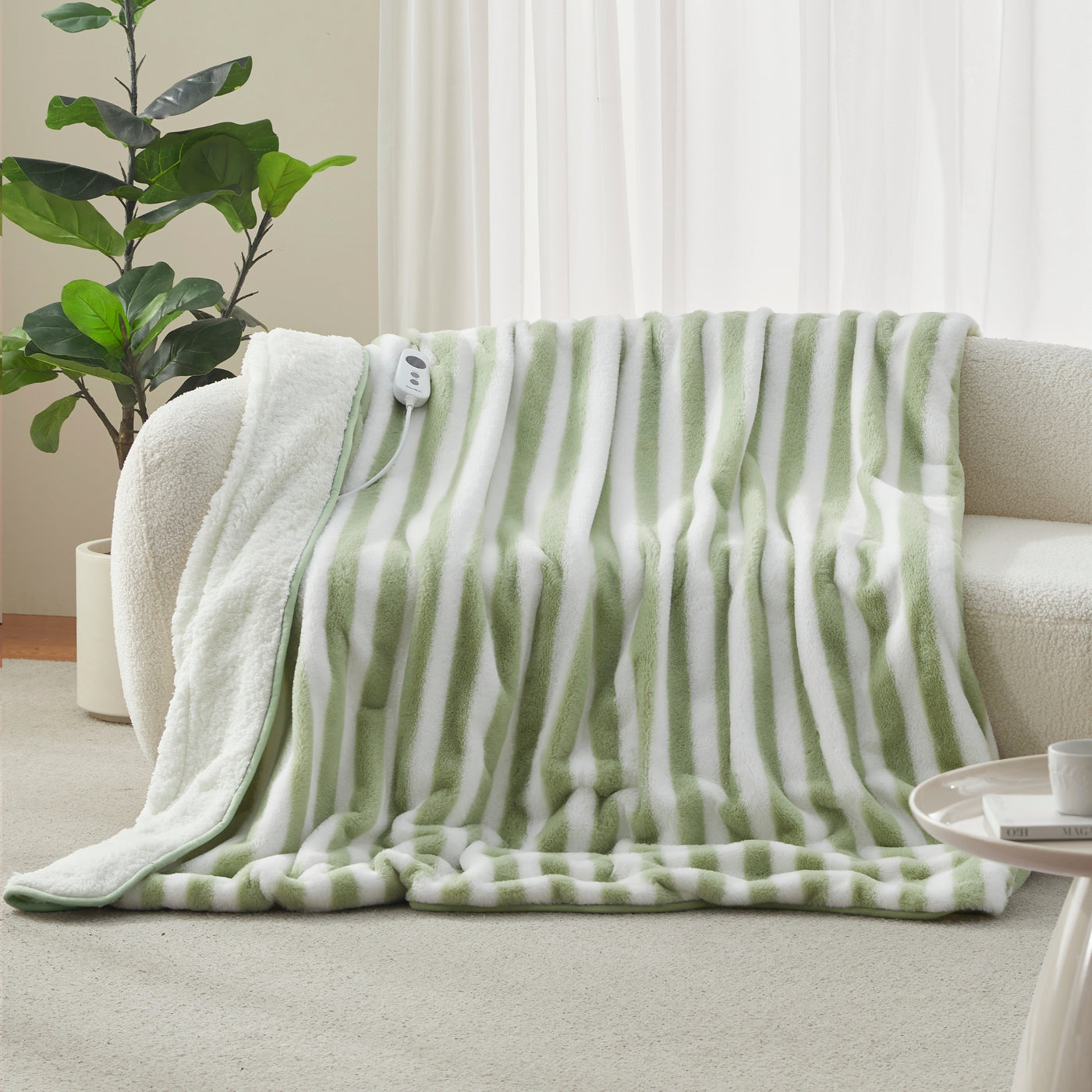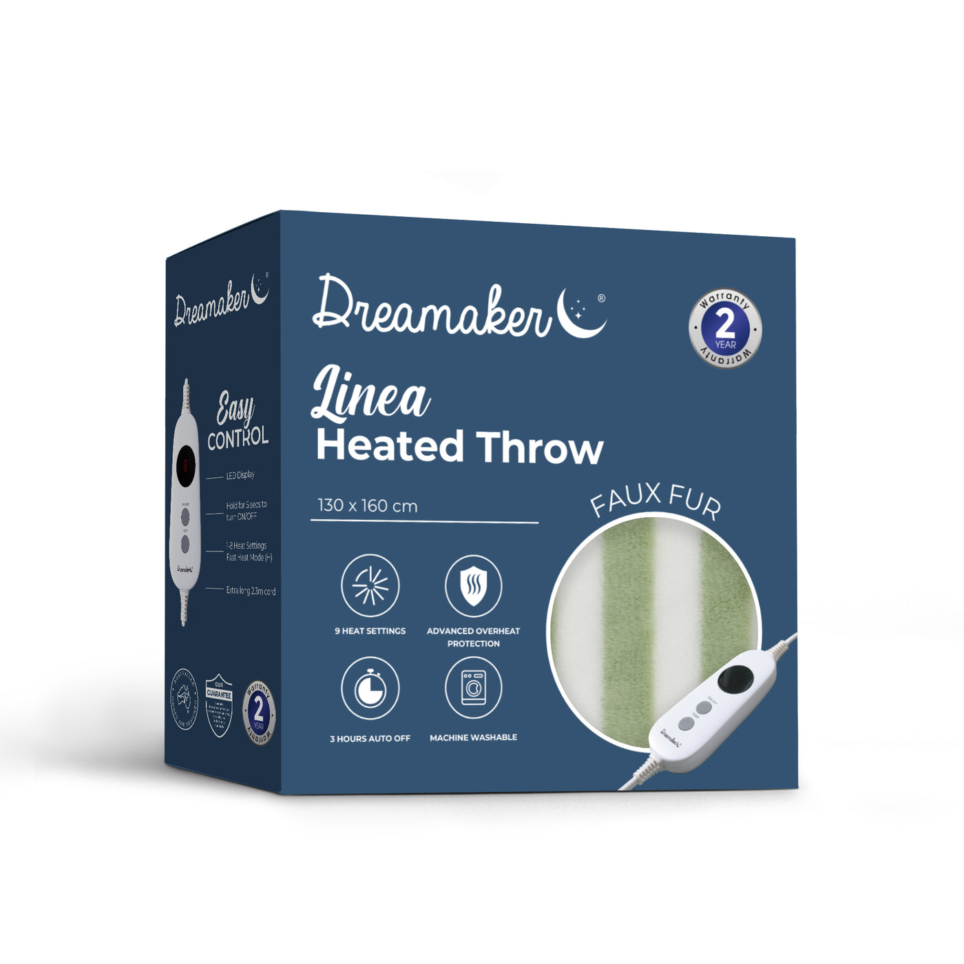 Snuggle up in style with the Dreamaker Linea Striped Faux Fur and Sherpa Heated Throw. Featuring plush striped faux fur on one side, and our signature cosy sherpa fleece on the other, the Linea gives you two luxe textures made for curling up, staying warm and looking good doing it.