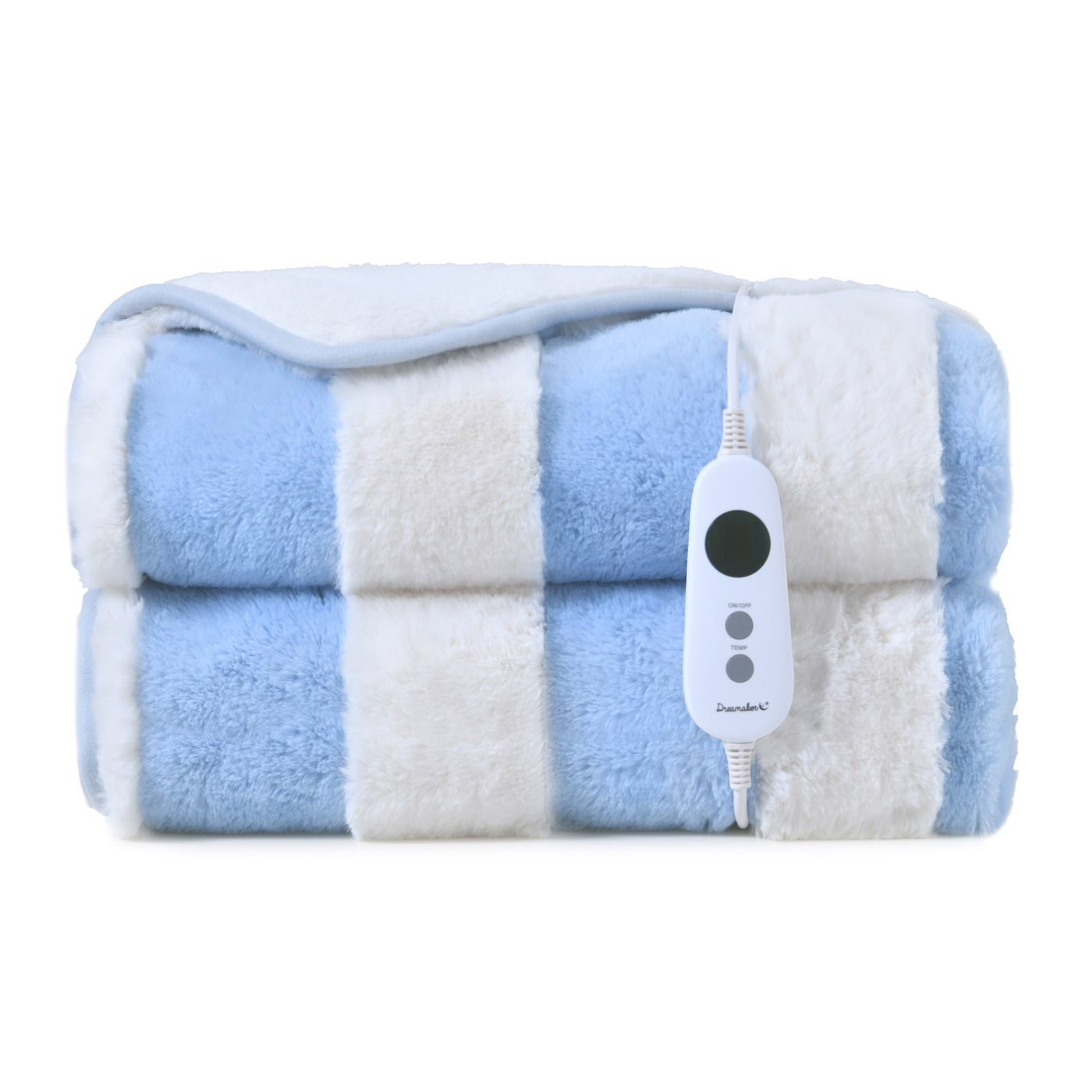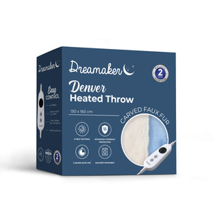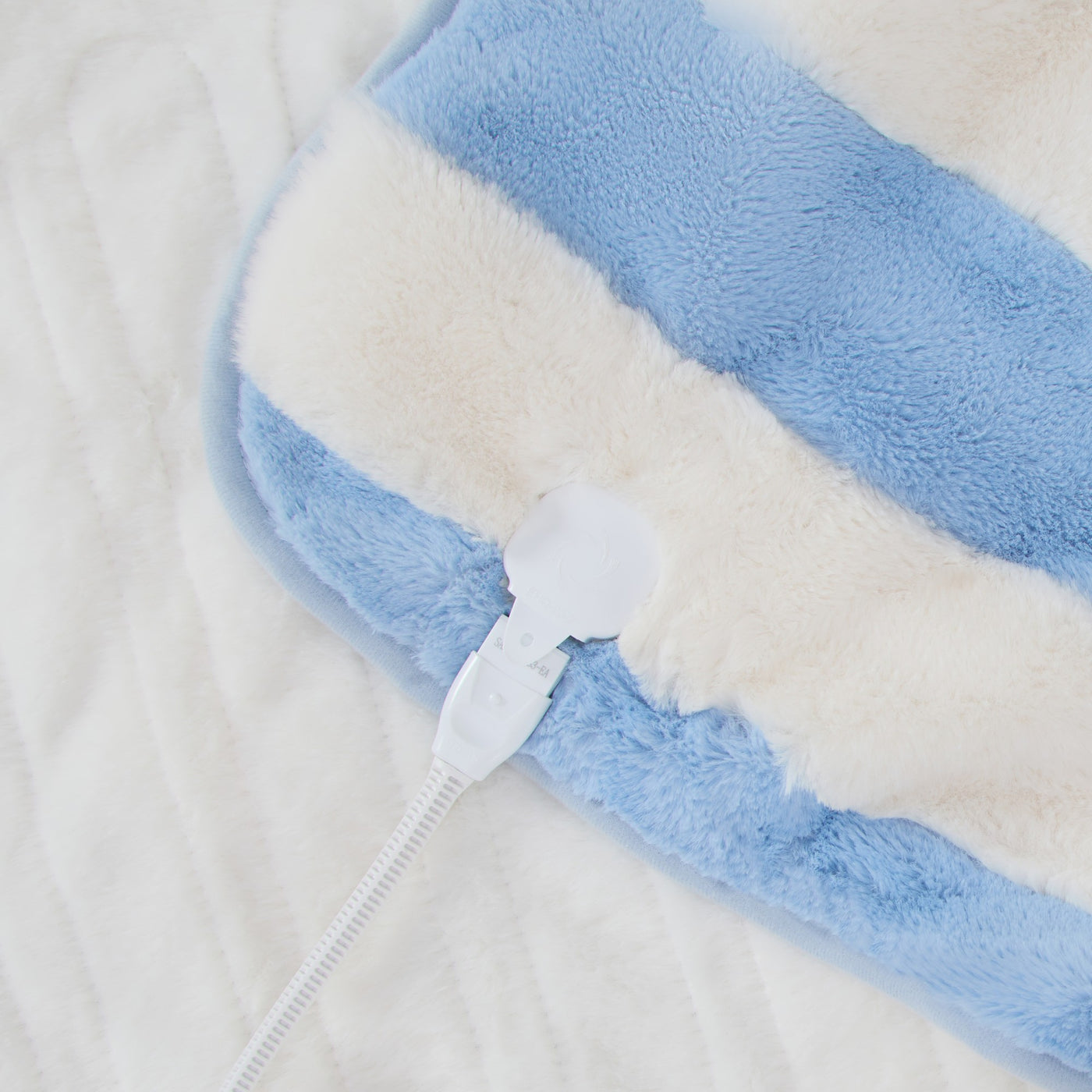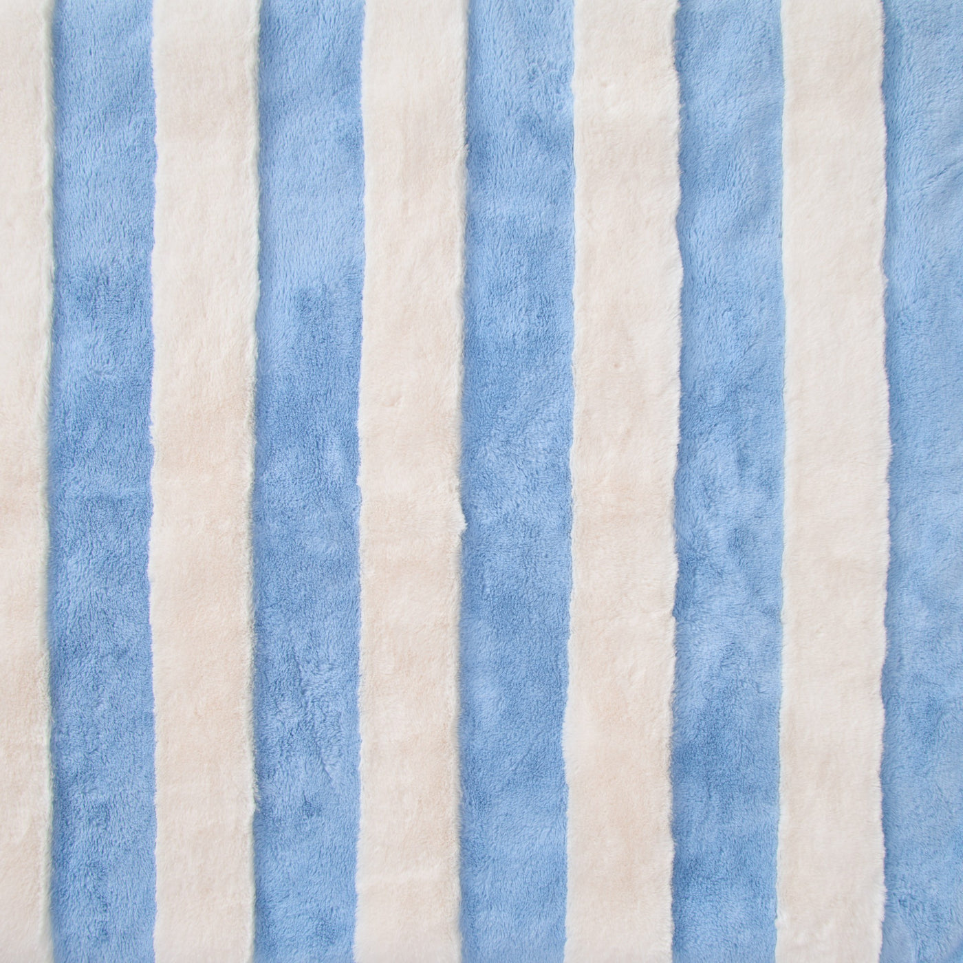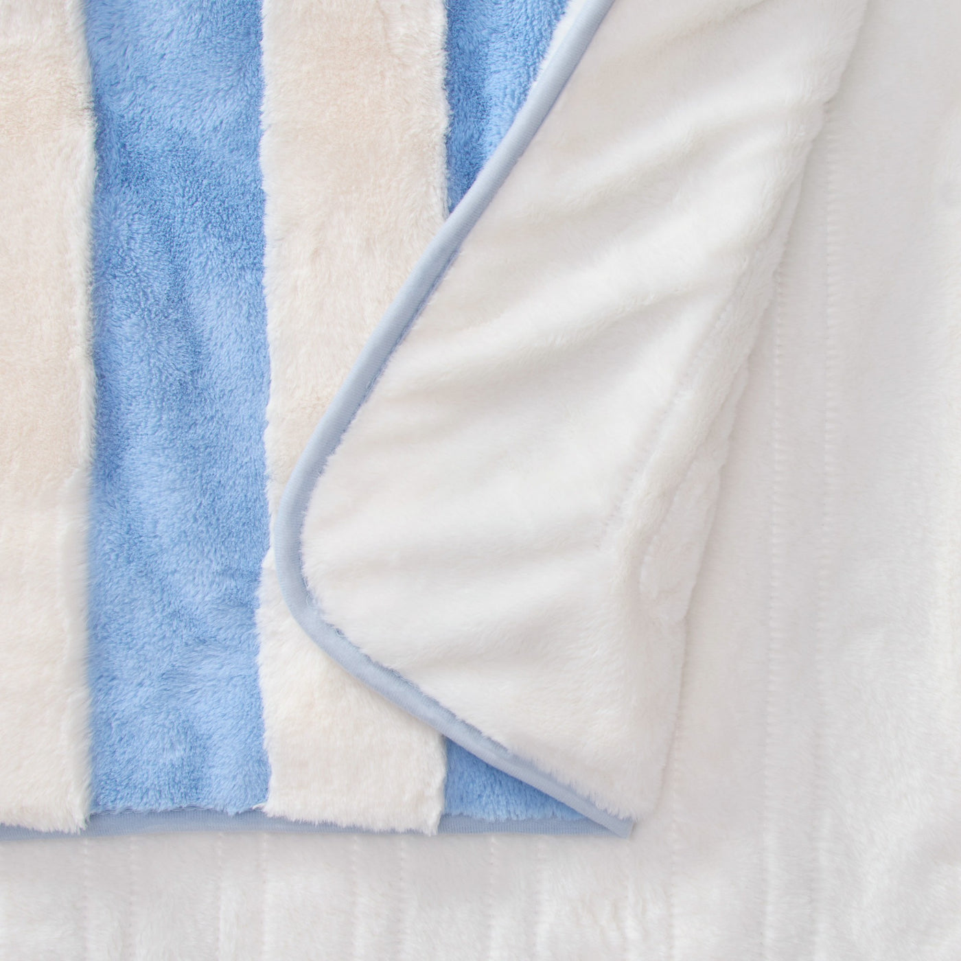 Introduce softness, texture and a gentle pop of colour with the Denver Carved Stripe Faux Fur Heated Throw in sky blue and creamy white. Featuring wide stripes carved into deep, sumptuous faux fur with a velvety, dense cream faux fur reverse for extra warmth and contrast, giving the Denver a decadent and playful style.
