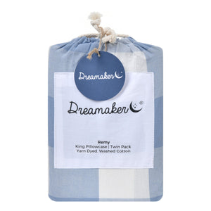 Bring rustic charm to your bedroom with the Dreamaker Remy Washed Cotton King Pillowcases in a twin pack. Made from pre-washed yarn-dyed cotton, our large gingham is woven to lock in rich colour and detail, while the washed cotton finish creates a lived-in, relaxed feel with a soft texture that only gets better with time.Features• Yarn-dyed cotton for long lasting colour• Woven giant gingham pattern• Ultra-soft, breathable washed cotton• Machine washable• Includes cloth bag for easy storage• OEKO-TEX certified - free from harmful substances• Mix and match our Washed Cotton bedding setsSizeKing Pillowcase - Twin Pack - 50 x 90cmMaterials100% washed cotton, yarn dyed.Care InstructionsCold gentle machine wash separately before use. Wash with similar colours. Do not bleach or soak. Line dry in shade. Warm iron on reverse if required. Do not dry clean.Designed in Australia.Made in China.