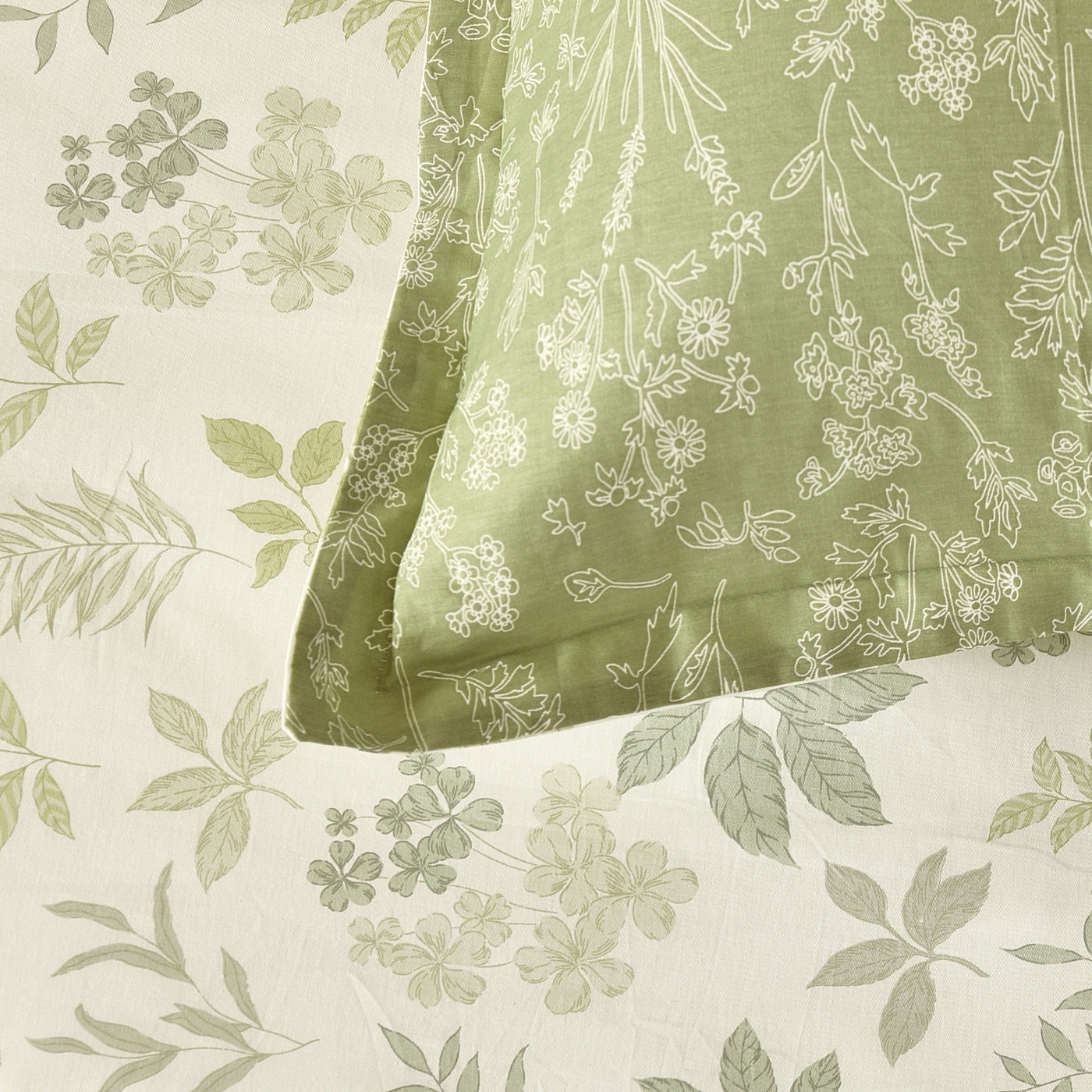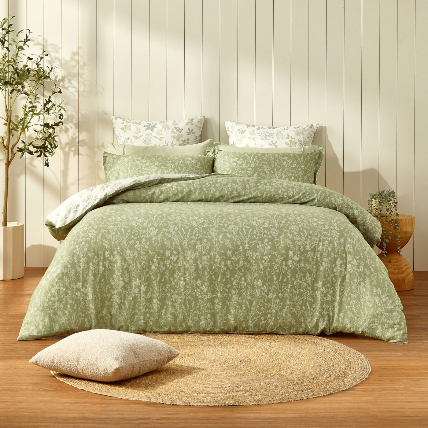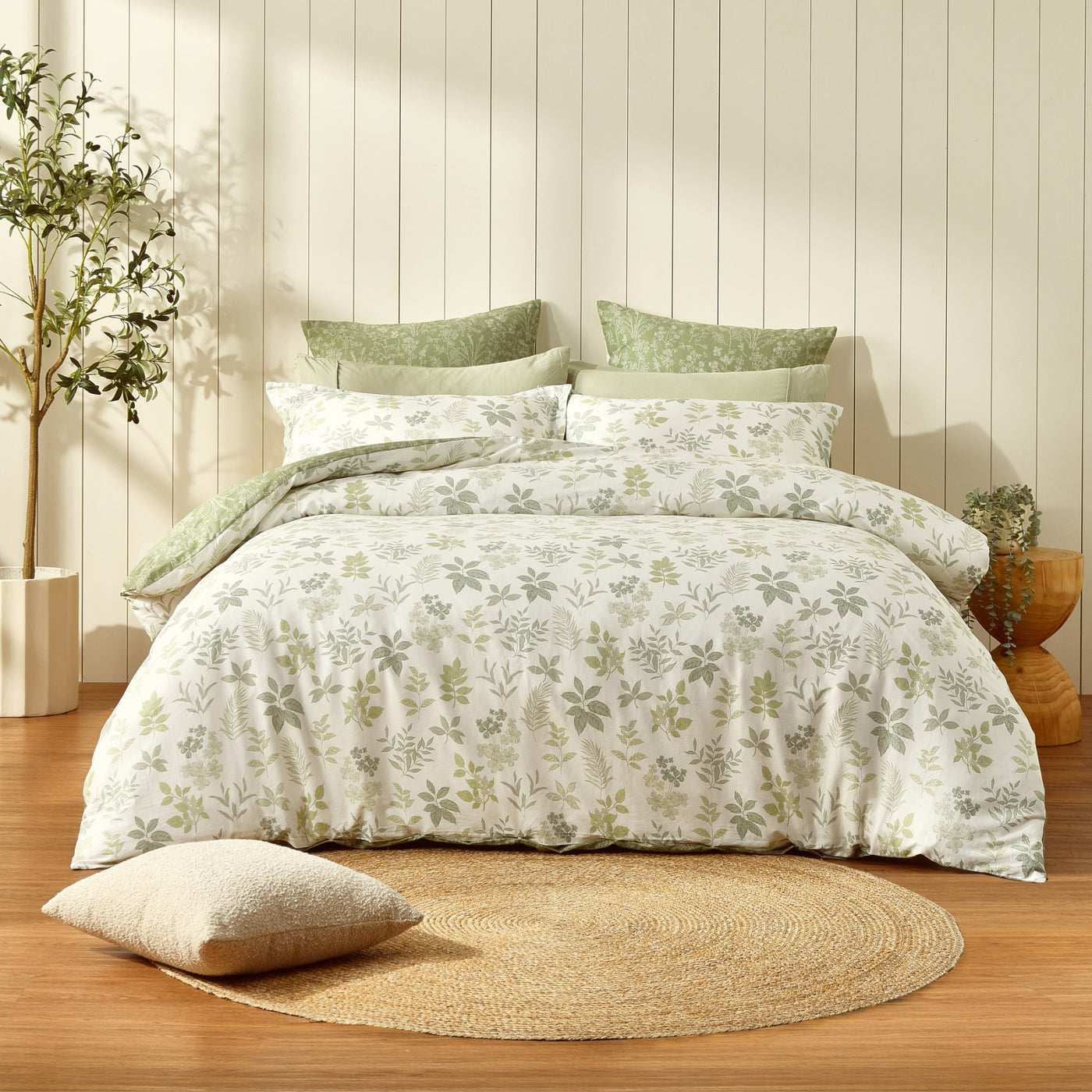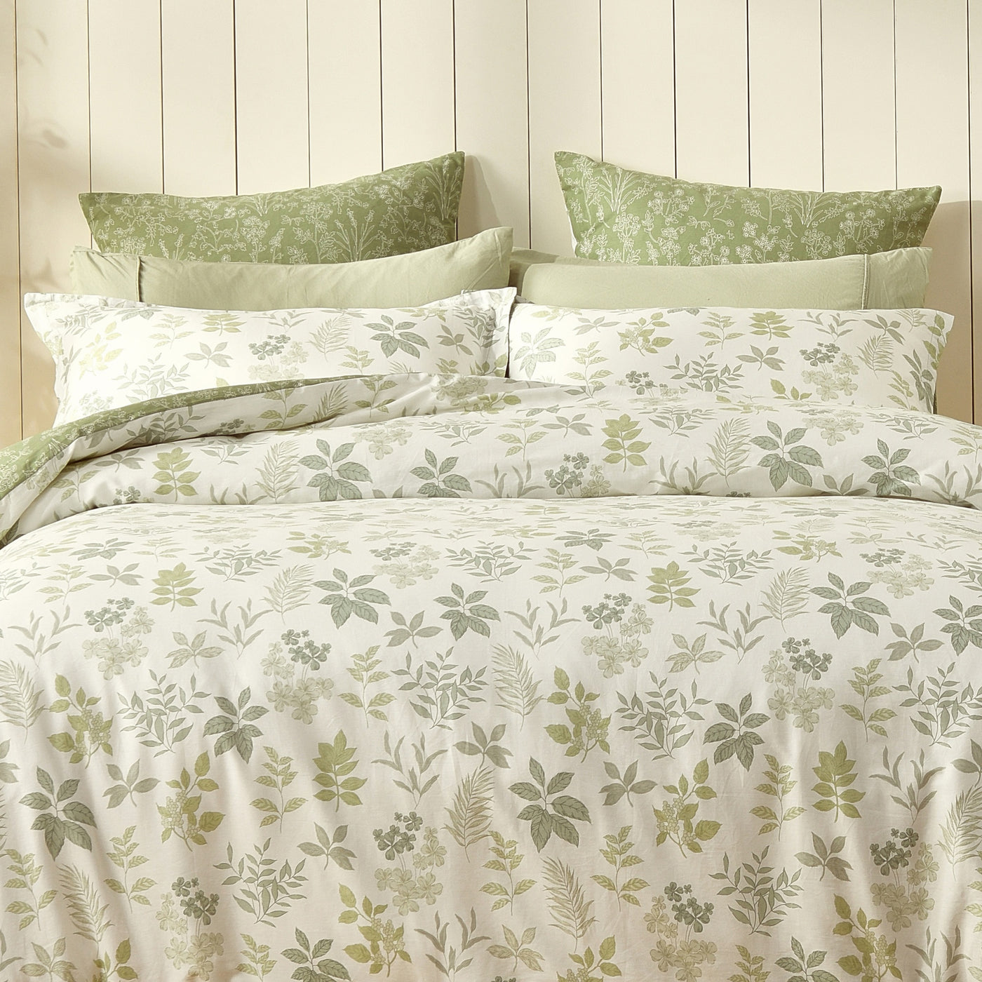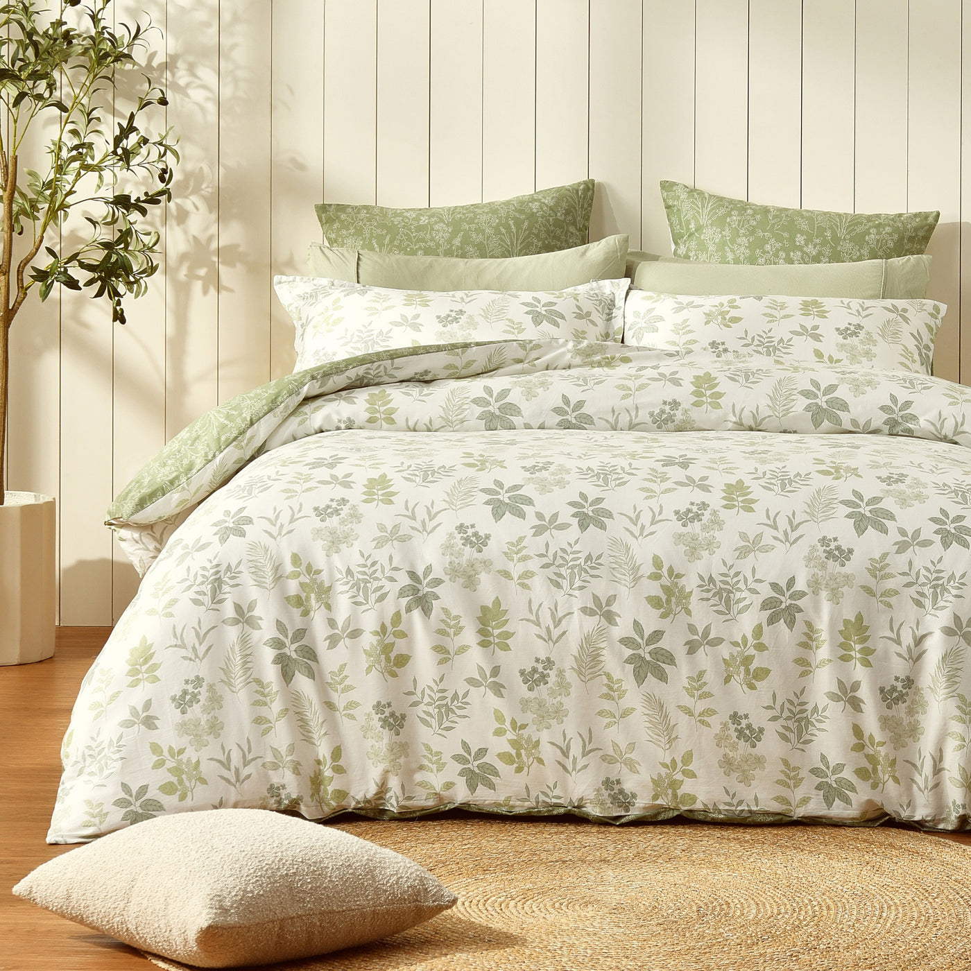 Enjoy the refreshing style of our Mabel reversible cotton quilt cover set - featuring a cottage style leaf print paired with subtle sage green floral. Made of breathable, 100% cotton, Dreamaker's reversible printed quilt cover sets have two unique prints on both sides of the quilt cover and matching pillowcases, giving you two styles in one.