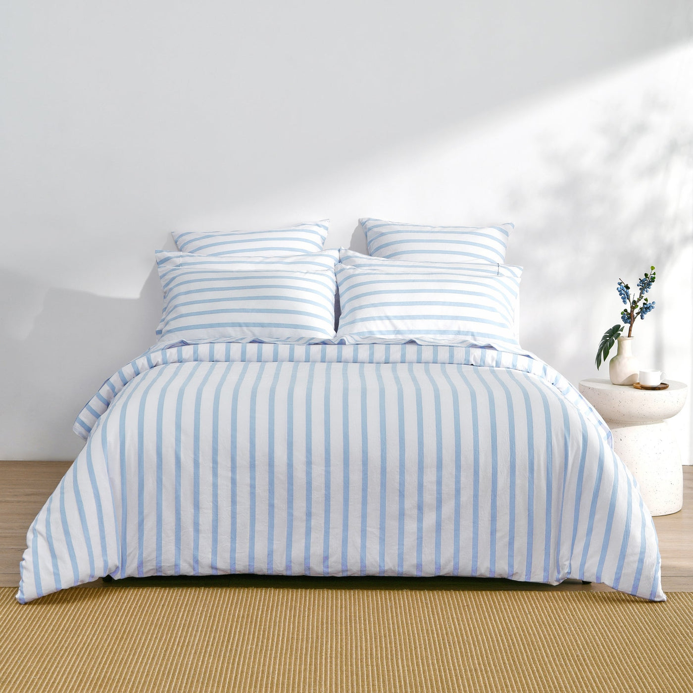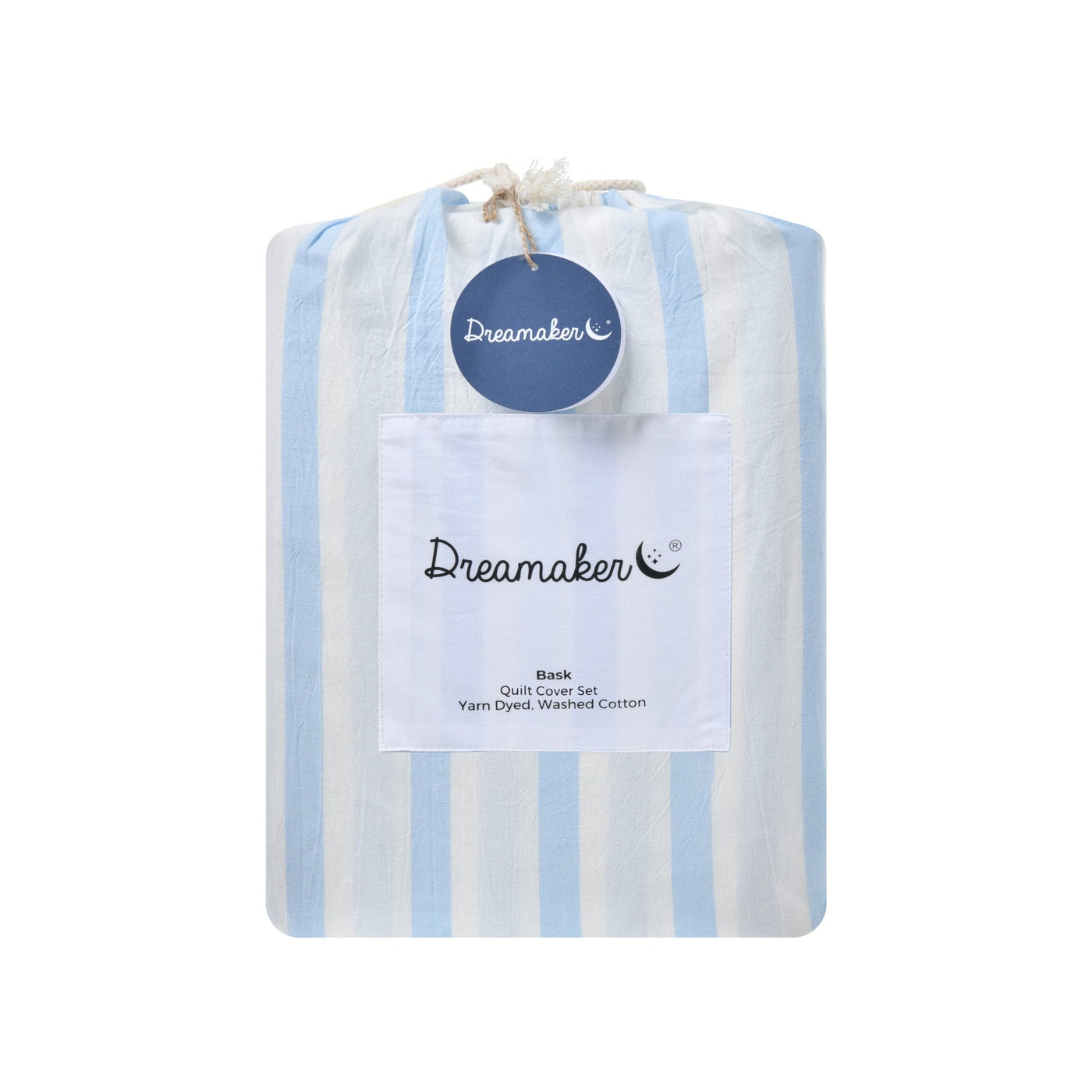 Relax in the sunny softness of the Dreamaker Bask Striped Washed Cotton Quilt Cover Set. Made from pre-washed yarn-dyed cotton, our striped pattern is woven to lock in rich colour and detail, while the washed finish creates a lived-in, relaxed feel with a soft matte texture that only gets better with time.Features• Yarn-dyed cotton for lasting colour• Woven striped pattern• Ultra-soft washed cotton• Breathable, lightweight• OEKO-TEX® certified - free from harmful substances• Machine washable• Includes cloth bag for easy storage• Mix and match our Washed Cotton bedding setsSizeSingle - Quilt Cover 140 x 210cm | 1 Pillowcase 48 x 73cmKing Single - Quilt Cover 160 x 210cm | 1 Pillowcase 48 x 73cmDouble - Quilt Cover 180 x 210cm | 2 Pillowcases 48 x 73cmQueen - Quilt Cover 210 x 210cm | 2 Pillowcases 48 x 73cmKing - Quilt Cover 245 x 210cm | 2 Pillowcases 48 x 73cmSuper King - Quilt Cover 270 x 240cm | 2 Pillowcases 48 x 73cmMaterials100% washed cotton, yarn dyed.Care InstructionsCold gentle machine wash separately before use. Wash with similar colours. Do not bleach or soak. Line dry in shade. Warm iron on reverse if required. Do not dry clean.Designed in Australia.Made in China.