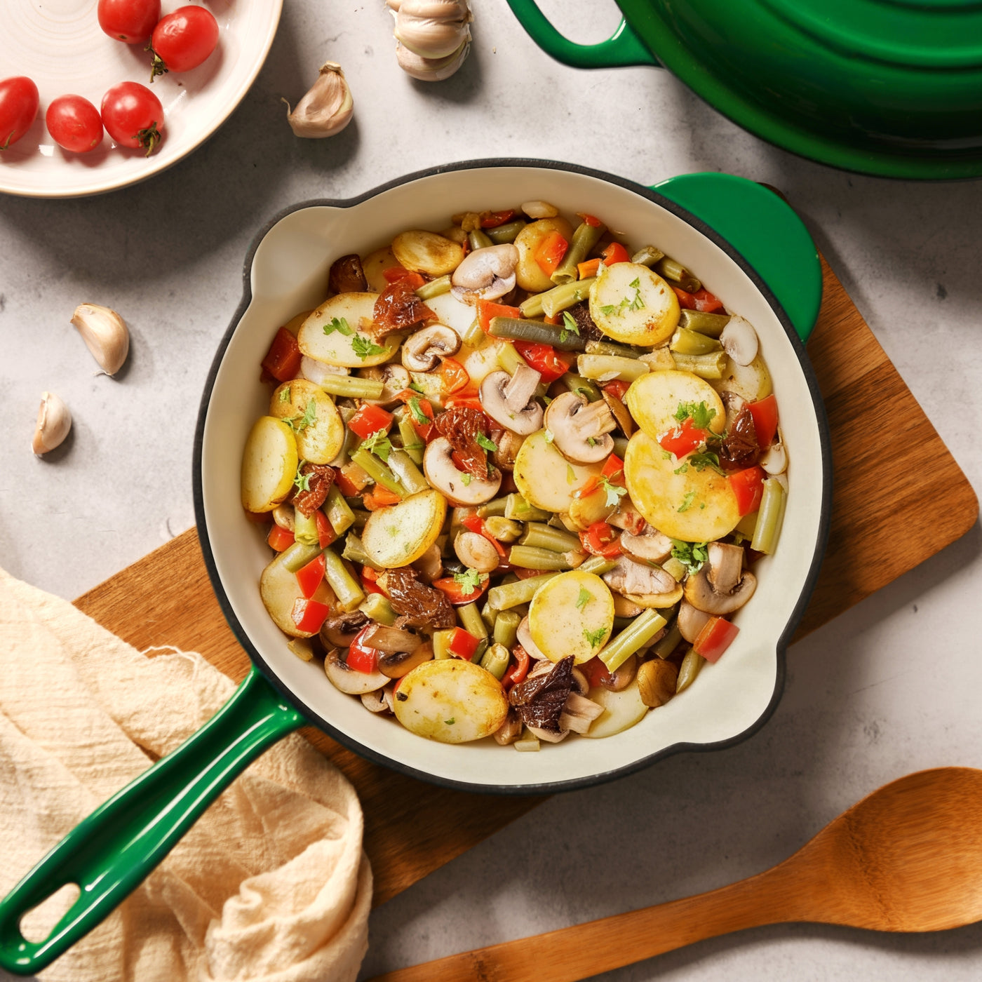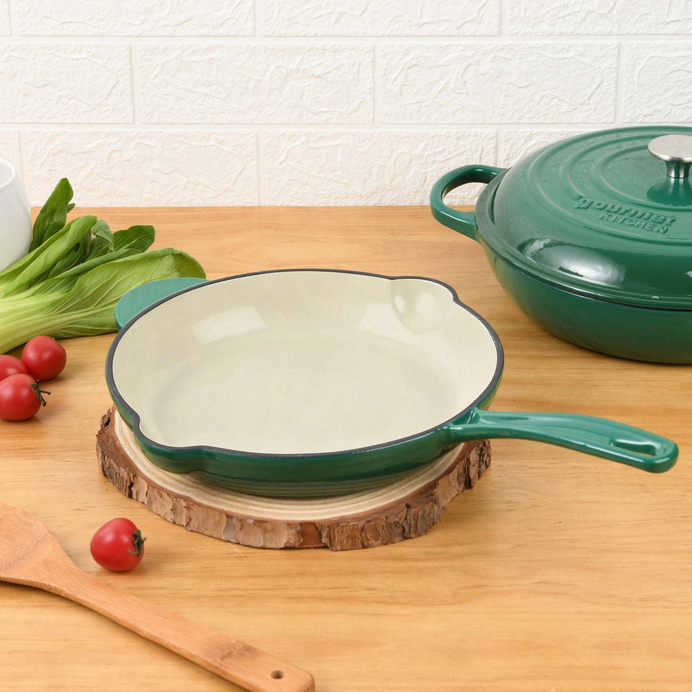 Crafted from heavy-duty cast iron and finished with smooth enamel,the Gourmet Kitchen Enameled Cast Iron Fry Pan delivers exceptional heat retention for perfectly seared steaks, golden veggies, and Sunday-morning eggs. Safe for oven, electric, gas and induction stovetop use, this versatile pan goes from sizzling to roasting in style. It's designed with a sturdy handle, helper grip, and twin pouring lips for easy serving without the mess. The enamel coating resists rust and cracking, so it looks as good as it cooks.Just skip the dishwasher and give it a little love by hand.Features• Durable cast iron with long-lasting enamel finish• No seasoning needed - ready to cook straight from the box• Superior heat retention for even, energy-efficient cooking• Handle, helper grip, and twin pouring spouts for control and comfort• Suitable for gas, electric, induction and oven• Non-reactive surface keeps flavours pure• Classic design built to lastSize26 cm x 4.5 cm (Approx. 2.3 kg)MaterialsCast iron with enamel coatingCare InstructionsAvoid sudden temperature changes - don't pour cold water into hot cookware.Hand wash only - avoid dishwashers to protect the enamel coating. Do not use steel wool or scouring powders. To remove burned or dried-on food, soak in hot water before washing. Use only non-stick utensils, such as plastic or wooden tools. Never cut food directly in the pan or use metal utensilsMade in China.
