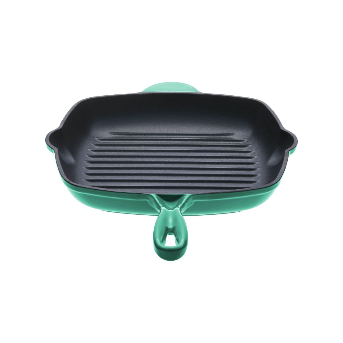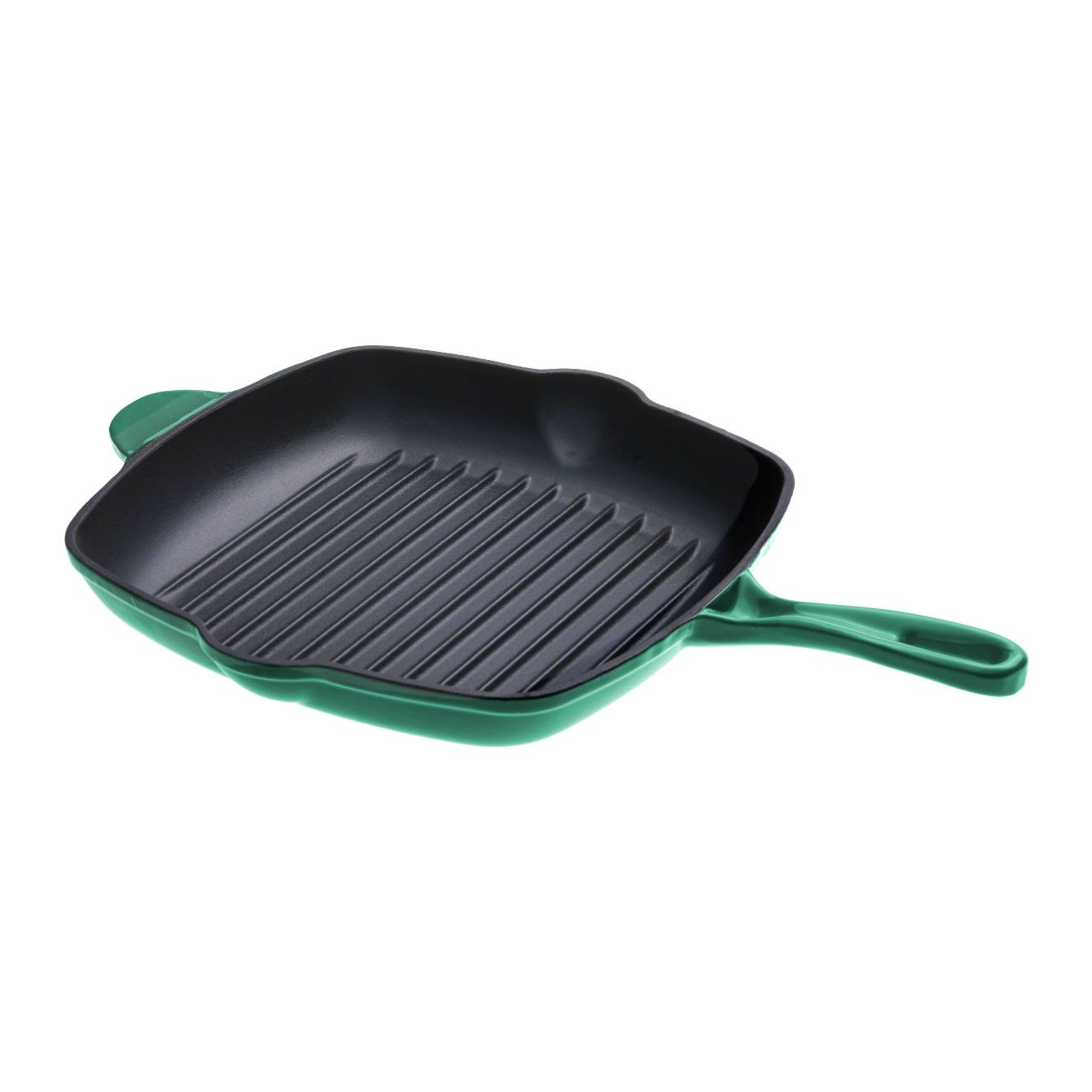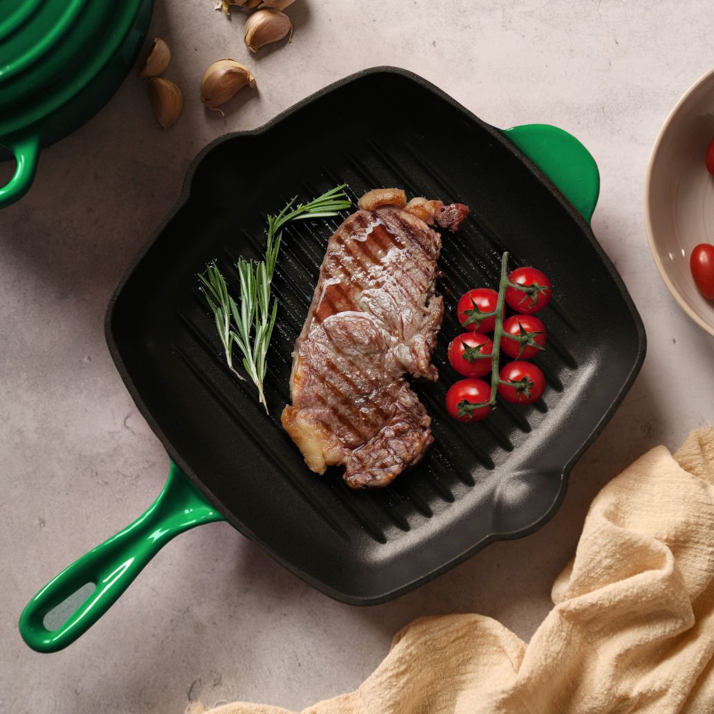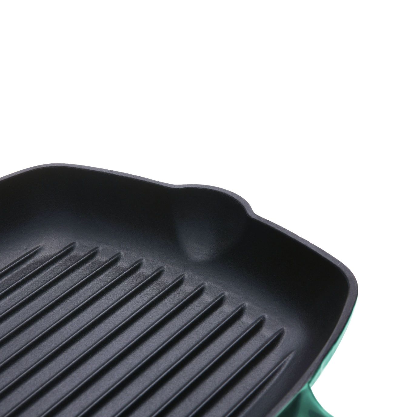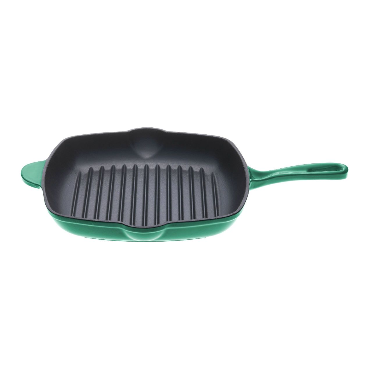 This gourmet cast iron grill is the perfect kitchen tool. Made from traditional cast iron and finished with high-quality enamel, this square pan can be used for grilling, frying, sauteing, and more. This product features an extra-wide cooking surface and a convenient grip handle. Whether you're cooking a quick meal or getting ready for a large family feast, this square cast iron skillet is made for the job.