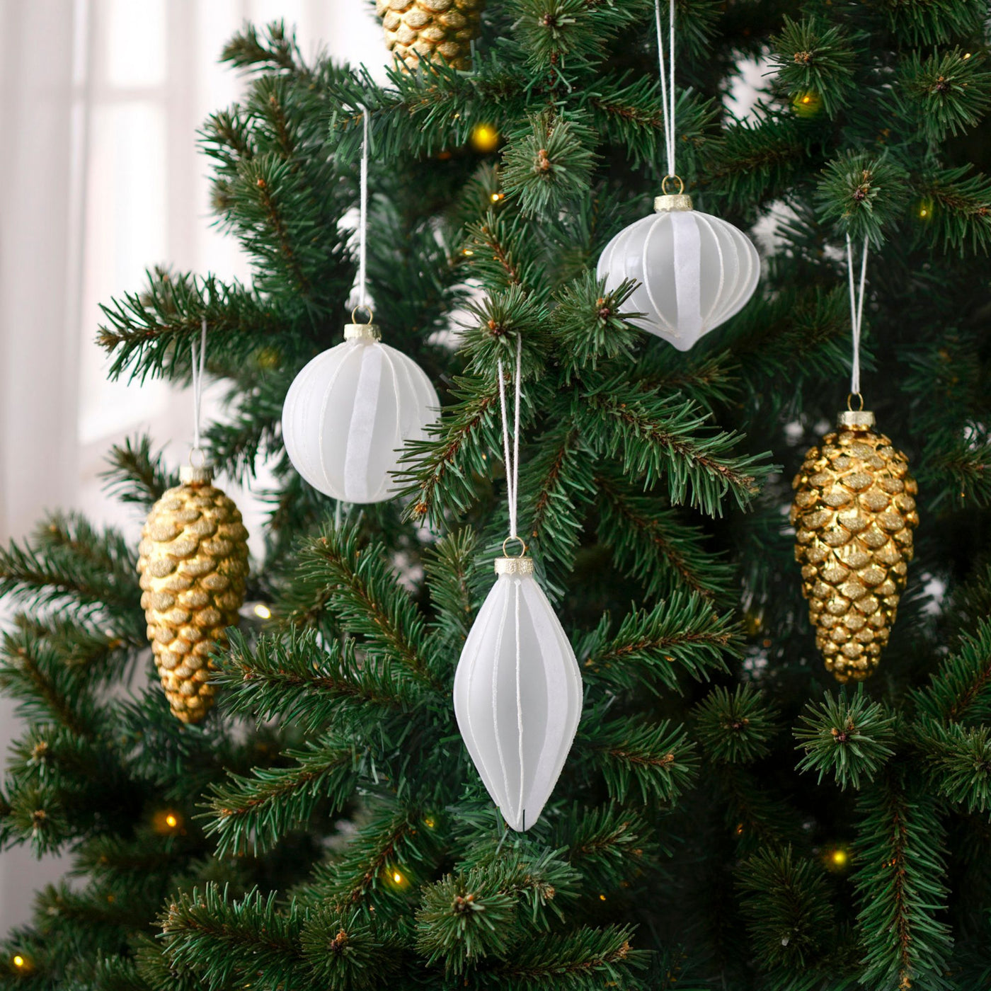 Add a graceful elegance to your Christmas tree with this Set of 6 Frosted Glass Baubles, featuring three timeless shapes - sphere, ellipse, and tear drop. Crafted from durable yet lightweight borosilicate glass, each ornament showcases a frosted finish and glitter stripe accents that catch the light with subtle sparkle.