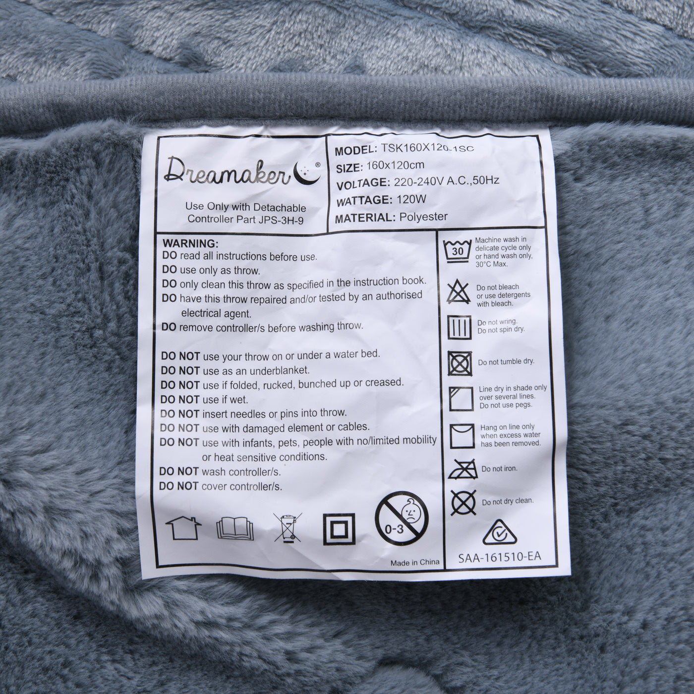 Snuggle up in silky soft mink faux fur with this cosy throw blanket. The gorgeous colours plays with the plush faux fur texture to create a style that works with all design interiors and flip over to enjoy a different texture on the reverse.The user-friendly heating controller lets you adjust the warmth for your comfort. Simply heat up on the fast heat setting (H) and then adjust from 1-8 once you reach your desired warmth. For your peace of mind, it will automatically turn off after 3 hours.Available in small size for individuals and large size for sharing or sofas.Features• Designed in Australia• Textured faux mink and flannel fleece, double-sided throw• 9 heat settings - fast heat (H), 1-8• Built-in 3-hour auto-off for safety and energy saving• Overheat protection for peace of mind• Detachable controller with extra-long cord• Machine washableSafetyDesigned to Australian SAA testing safety standards3-hour automatic-off functionNot for use as an underblanketSize160 x 120cmMaterialFront: 310gsm faux minkReverse: 220gsm flannel fleeceCare InstructionsRemove the controller before washing. Do not put controller in wash.Machine wash in delicate cycle or hand wash at 30°C Max.Line dry in shade over several lines without pegs. Remove excess water before hanging.Do not bleach / tumble dry / spin dry / dry clean / wring / iron.Designed in AustraliaMade in China