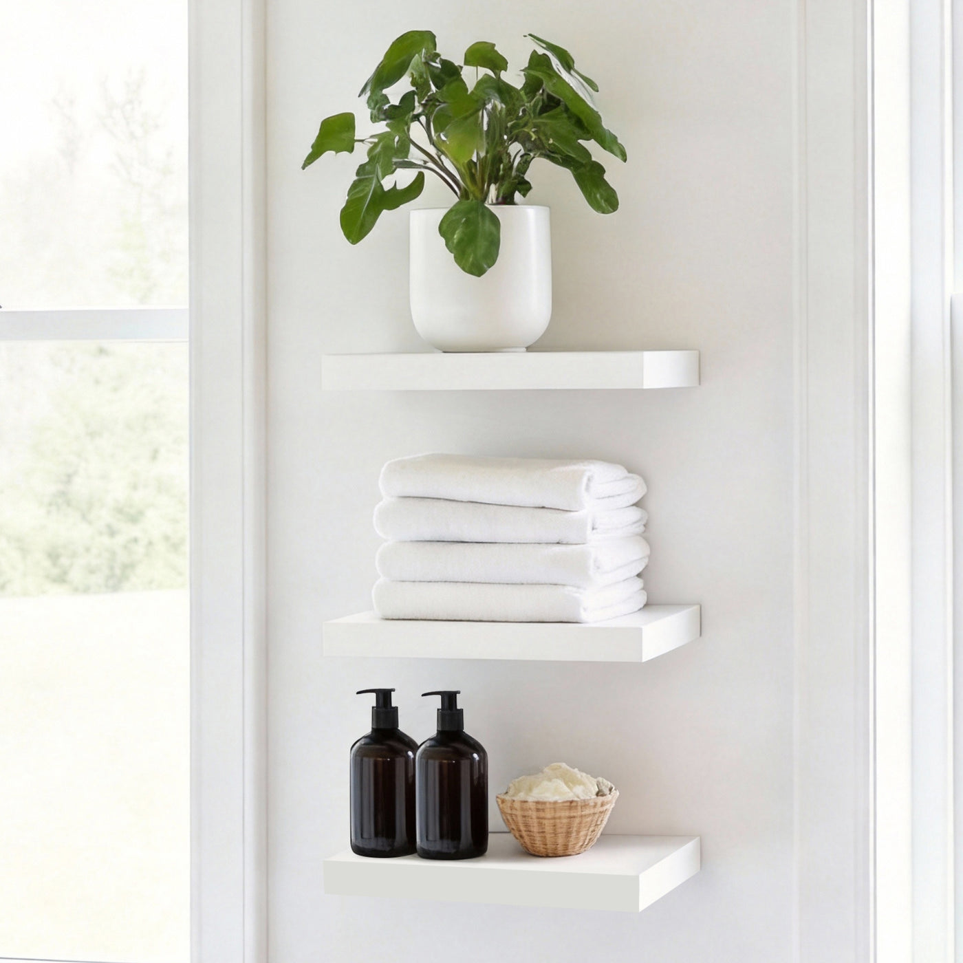 Crafted from durable MDF with a smooth, water-resistant laminate finish, each 60cm shelf is built for everyday use. Easy to install and maintain, the set of three shelves gives you the flexibility to create custom arrangements that suit your space and lifestyle. With a weight capacity of up to 5kg on plasterboard and 10kg on brick walls, they provide dependable strength with a clean, versatile finish.