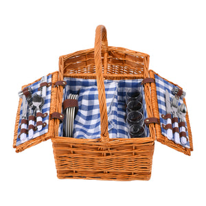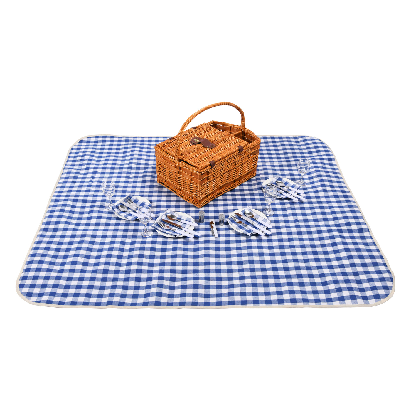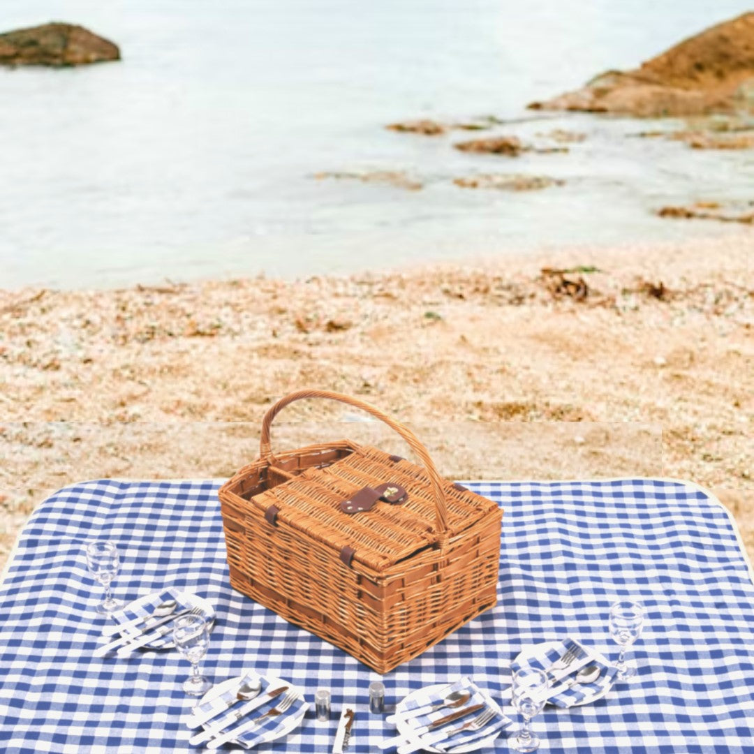 Tasmania 4 Person Natural Wicker Picnic Basket Set with Blue & White Gingham Rug - Tan Basket 48x33x20; Rug 1.3x1.5m