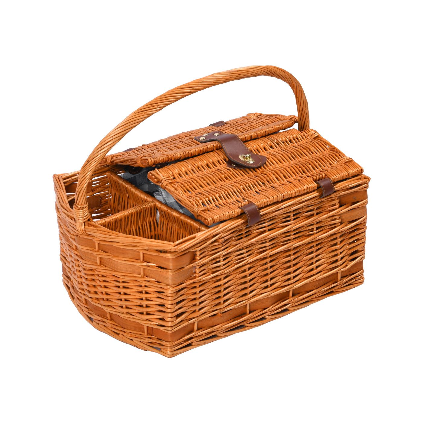 Introduce even more fun, style and elegance to your next picnicking adventure when you choose the Sherwood Ascot and Tasmania 4-Person Natural Wicker Picnic Basket Sets. A picnic is all about celebrating the outdoors with family and friends and the set achieves this effortlessly with a full wicker basket featuring a pleasant woven lattice design with everything included for the perfect picnic. The gentle curve of the handle offers a lovely detail, while also making the set simple and straightforward to move from place to place. The contents are secured with a wicker lid — complete with the same woven design and fastened with polyurethane leather and plated iron fittings. There's even a handy compartment perfect for carrying wine or other drinks, adding to the practicality of the set.